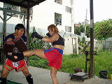 行ってみるとまさにスラム一歩手前の中を忍者の抜け道みたいなところを通る羽目になった。雑草生い茂る中、トタンで壁だけ作り屋根の下にリングとサンドバックなどがあるだけの至って『普通な』ムエタイジム。そこですーさんと管理人はさっそくサンドバックを蹴る、蹴る、蹴る。が、そのサンドバックはもうすでに形が変形していて、凹んでいるところはともかく、出っ張っているところを蹴るとメチャ痛い。さらに表面がヤスリのようになっているのもあって、そこなど蹴るとそのまま摩擦で脚は真っ赤。シャレにならんね、と思いながらおーどりーさんの準備を待つ。準備が終わりおーどりーさんと対峙する。彼女からだが小さいうえに、小さく構えるものだからモノスゴク小さく見える…。が、冗談で蹴り合っていたとき左のローからミドルの蹴りを受けて、私よりも周りがどよめく…。さすが素人には出来ないコンビネーションである。その後おーどりーさんは女性と言うことでリングの上には上がれないため、リング下でミット打ちが始まる。スバラシイ。どうしてああもきれいに連打が出来るのだろうか。管理人たちがやると思いっきりヘッピリになってしまう。それから管理人とすーさんはリングに上がってミット打ちをやらせてもらった。10年ぶりのリングである。最初はパンチもおぼつかない。トレーナーに教えられながら少しずつ思い出す。左、右、右ミドル。おまけの左ミドル。このコンビネーションを学ぶ。その後すーさんもチャレンジ。すーさんはもと空手家である。しばらくするといい音がし始めてきた。リングから降りてからとうとう人体実験コーナーが始まる。そう、まずは12か14オンスのデカいグローブを付けてのボクシング。管理人の左目は網膜剥離でシリコン入り、つまり殴られてはいけないため、右のパンチを顔に入れないようお願いする。(一応彼女はサウスポー)さて管理人、困ったことにボクシングなどやったことがない。先ほど書いたように、思いっきりピーカーブースタイルの彼女はどこを殴っていいかわからないほど標的が小さい。それに引き替え素人の管理人はどこでもどうぞと言うくらいのガードの甘さ。とりあえず左のジャブで距離を取る。それから右で…、オイオイ、もう詰められちゃうのかよ…。あっという間に距離を詰められて小刻みにボディに連打。軽くやってもらっているのでこれは問題なし。それから少しずつなれたころ、思わず管理人の右のフックが結構いいあたりで入ってしまう。さすがに殴ってビビる。おもっきり殴って当たったら大変ですから。なんというか力加減がわからないのだ。力入れない=スピードが出ない。オーなんと情けないことよ。そうしているうちにお互い力が入ってきて、予想していたおーどりーさんの左のショートフックの連打を顔に浴びるようになる。これは痛いと言うよりも手の打ちようがないのに参った。もちろん試合用のグローブであれを食らったらシャレにならんが、接近戦になるともうお手上げ。押し戻すのも大変。思わず首根っこをつかんで投げ技に持って行こうかと思ったものだ…。そして2ラウンド目、すでになすすべのない管理人はひたすら防戦一方である。たまに右パンチが入るが、すぐ押し込まれる。そしてあろう事か敵に「背を向けて」しまったではないか…。屈辱である…。それから今度は蹴りの威力を試すことにする。自称超〜軽い蹴りをボディで受けることに。まずは右。気合いを入れて待っていたらあばら骨の下の部分に当たった。痛い…。お次はメインの左。先ほどの骨の痛みを身体が覚えているためか、両手を上げていたのにもかかわらず、ついつい右肘が下がってしまう。おかげで蹴った方が痛い。蹴られた方はまあなんとか、って感じ。これを息を抜いたときに全力で蹴られたら…、ゾッとしますねえ、マジで。それからムエタイ流の蹴りを教わってその練習。これまでの蹴りと間合いが違うので、当たり所が悪くさらに脚が痛くなる。ちょっとやってギブアップ。ああ、情けなや。ホント目が悪くなかったら、これからジムに通いたいと痛切に感じ入ったのであった。