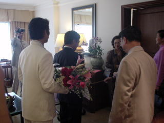 で、迎えに行くのは当日泊まる予定の部屋。15分で準備が終わるからと言われたが、結局30分以上かかったのはタイらしい所。準備が終わった所で、「大人数で行くとうるさいので5人くらいで行ってください」と言われる。で、ゴルフの師匠であるT氏がプーヤイの役を務めて行くはずだったのですが、写真を撮りたいという人続出。掛け合ってみると「うるさくしないならどうぞ」とのこと。結局みんなで行くことになった。で、部屋につく前まですったもんだして、何とか入ってみると、中にはマッピーの親戚のおばさん(女性のみだった)たちが、自分たちの持っている金のネックレスなどを掛け合わせて門を作っている。そこにT氏を先導として進む。そこでT氏は「通してください」と聞かなければならない。すると「通りたかったらお金を払ってください」と言われる。そこで準備していった赤い封筒にお金を入れておいて渡すのである。中には「もっとください」と言ってくる人もいて、そうするとまたその封筒をあげなければならない。そのためにかなり余分に持って行ったのですが…。実はたくさんあげることが前提で一つの封筒にそれほどお金を入れてなかったんですよね。100バーツと40バーツの封筒を用意してたのです(そうするように言われていたもので)。が、後で聞いたら普通200バーツとか400バーツとか入れておくらしいのです。う、それならそうと言ってくれれば。。。おかげで赤い封筒がたくさん余ってしまいました。おまけに赤っ恥まで。。。そんな感じで銀金玄関を4つ程度くぐり、部屋の奥にいる新婦のもとへ。持ってきた花束を渡し記念撮影。それから結婚式場へ戻ることに。