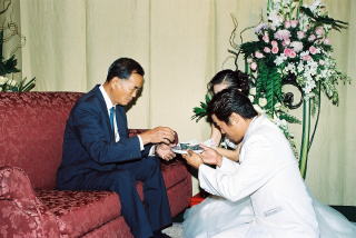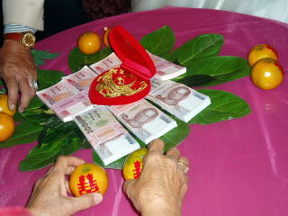それを片づけるとお茶配りの儀式に入ることに。これは親戚に「親戚の仲間に入れてもらうため」に行う儀式であるらしく、その順番も「親戚の格」によるものだそうだ。もちろん最初はマッピーのご両親から。お茶を差し上げると何かしら言葉をかけてくれる。そしてお茶のお返しに御祝儀がもらえる。それに対してこちらも用意しておいたお返しを渡す。ちなみにこのお返し、普通の親戚にはただのタオルだったようだ。で、この時にいただくお言葉、当然「これから幸せになるように」と言ってくれる方が多いのだが、さすがは中華系、「お金持ちになれるようにね」だって。おいおい、ここでも金の話か〜!で、マッピーサイドが終わると今度は管理人サイド。と言ってもこの儀式、自分たちよりも年上しか対象でない。そのため管理人サイドはお母さん、T氏、親戚のおじさんおばさんだけになってしまった。知らずに弟たちを呼ぼうとして怒られてしまった…。知るか、そんなこと。