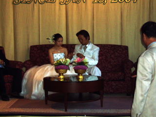 さて、当日午前7時半、これが日本人側の集合時間となり、みんな集合。となるはずでしたが、前回書いたようにYASさんは寝坊、そのほかにもちょっと遅刻した人ありと、相変わらずのんびりしたスタート。日本人は結婚式をする場所で雑談、タイ人は控え室でお茶を飲んでる。全然始まる気配なし。なんだ?いったい何時から始まるのだ?と思ってマッピーのお父さんに聞くと、「大丈夫大丈夫」。ってあなた、7時半に呼んだのは誰?とは言うものの、さすがのタイ人もこの時間(8時39分)だけは大事だと見えて、もうすでに全員そろっている。これにはかなり驚き。が、もらっている段取りだともうそろそろしなくちゃいけないことがたくさんあるのでは?と思っていたら、なんと段取りが突然変更。って言うか、ホントはどの段取りが正しいのかさえ分からないんですね、みんな。その場にいるタイ人がみんなであ〜だこ〜だと言っているんですから。。。で、結局指輪を交換する前にするのはなし。時間が来たらマッピーがやってきて、しつらえられた席に座り時間を待つことに。実にマタ〜リした気分。で、誰の時計でその時間になったのかさえ分からぬまま、「ハイ、まおさん指輪」、と言う声。で、管理人のお母さんから指輪を受け取りマッピーの左手薬指にはめる。ちなみにこの指輪5号。。。子供の手か!?で、今度はマッピーがお父さんから指輪を受け取り管理人の左手薬指に。ちなみに管理人の左手薬指は昔脱臼したまま変な形で固まってしまっているので、非常に指輪を入れにくかったりするので、結構手間取ってしまった。で、無事に指輪の交換も終わりそれからマッピーはまた部屋に戻っていった。これから例の銀金玄関(金銀でいいと思うのだけど)を通り新婦を迎えに行く儀式に移るらしい。