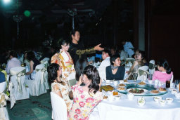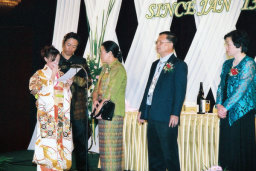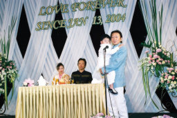 会場に戻って再度入場。ここではマッピーのリクエストで倉木麻衣のSTAY BY MY SIDEがかかる。相変わらず段取りがよくってなかなか音楽が鳴らない。やっと鳴り始めた音楽に、すでにじれていた我々はスタスタと入場開始。当然先導なし。が、今回は全テーブル廻ると言うことだったので、どっちに行っていいやらさえよく分からない。おかげでタイ人サイドの方はかなり早足になってしまいました。日本人サイドの方はみんなから「もっとゆっくり歩け」と言われてスピードダウン。各地から「七五三みたい〜」という声が。そう、まったく七五三の子を連れて歩いているようにしか見えないマッピーでした。何とか一周終わって着席。ここからが日本風披露宴の始まり。