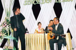 最後をしめるのが管理人の挨拶。で、ここで一大事発生。実は準備しておいた原稿、タイ語と日本語のものがあったんですが、なぜかそこには日本語のものだけしか置いてない。日本語なぞなくても読めるワイ〜、タイ語はどこじゃ〜と思ったものの、その場の雰囲気的に言い出せるはずもなく、まずは日本語でご挨拶。ところが、、、その原稿を見てしまったためにかみました、ハイ、マシンガントークが泣きます、これじゃ。思った通り適当にしゃべればよかったのですよね、ホントは。で、問題のタイ語版。なるようになれ〜と思いながらタイ人の方を向き、「サワディークラップ〜」とスタート。後は何を言ったのやら。が、終わった後マッピーに聞いたところ「全然問題なし」と言うことでした。おー、本番に強い男だ。とほっとしておしまい。