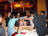 さて、二次会と言っても超内輪的だったのですが、管理人が前々からお願いしておいたイベントがありました。それは日本人のトモにタイ国歌を、タイ人のピンポンに日本国歌を歌ってもらう、というものです。はっきり言って君が代は簡単でしたが、タイ国歌、これはメチャメチャ難しく、みんなチョットやばいかなと思っていたのですが、なんと彼は毎日ビデオをすり減らすほど国歌を練習してきたらしく(タイ国歌のCDを結局探すことが出来ず、毎日放送しているタイ国歌をビデオに収めて練習した)、アカペラで見事歌い上げました。これにはタイ人も唖然。って言うか、管理人も唖然。もちろん曲の終わりにはチャイヨ〜!3連唱。これはさすがに彼も忘れていたらしく、GOLちゃんと管理人がタイミングよく蹴りこみました。君が代は当然胸に手を置いて静聴。いやあ、よかったです。ホントは結婚式で使いたかったのですが、トモが時間に間に合わないので二次会になってしまったんですよね、あ〜もったいない。