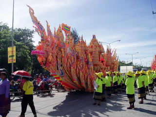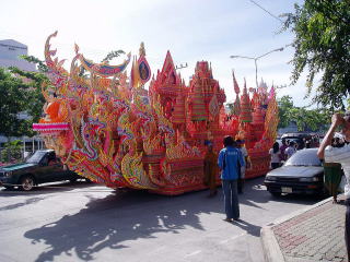 それを最終地点で審査して順位を付けるそうです、優勝すれば賞金が貰えるので装飾も年々派手になってる様な気が。でも、これって日本人が見ても余りの派手さに目を奪われてどれも似たり寄ったりに見えるんですけど、タイ人にはそれぞれの見分けがつくらしい。今年はどこのお寺のが良かった、とかと話に花を咲かしてます。