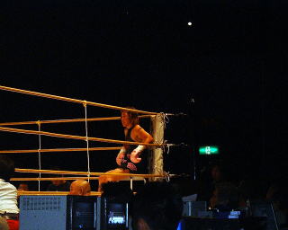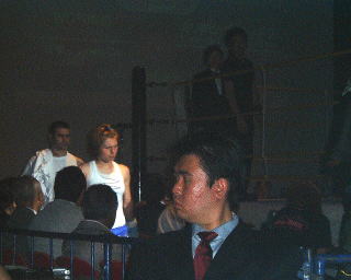 2004年6月27日、場所はニューピア竹芝ホール。当日の6試合目、イベント上は2試合目になりましたこの試合、管理人だけ全然違うところに席があって、仕方なく地べたに座って観戦しました。前回の試合よりも(一応ビデオで見た)身体が締まっているカピオリ。その後入場曲に乗って登場するはずのおーどりーさんが出てこない。いつもは早すぎる位の入場なのに、あまり遅くて何かあったのかと思ったほど。結局走って入場。後で聞いたところによると守衛がGOサインを出さなかったので出なかっただけだそうな。。。でもって試合。1R目、相変わらずオーソドックススタイルでのサウスポー。が、今回のカピオリ、異常なテンション。って言うか強え。思いっきり踏み込んでのパンチを連打。おーどりーさんの顔がぶれる。ちょっとガードの低いためかよくパンチを入れられる。おーどりーさんの間合いまで入れない。結局押された感じで終わってしまう。会場からもため息が漏れる。(管理人ジャッジ9−10)