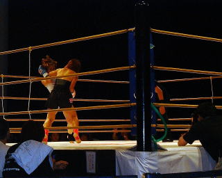 さて4Rに入って相手の右ストレートとおーどりーさんの左フックが差し合う。開始後しばらくは左の方が近いせいかおーどりーさんのパンチの方が当たる。そしてそのパンチは確実に効いている。お、いけるぞ、と思ったが、何かおかしい。そう、おーどりーさん、右のパンチがほとんどない。ほとんど合わせるだけ。これはケガしたか?と思ったのだが、実はケガしたのではなく、ケガしていたらしい。右腕肉離れ。。。こないだは足の骨。今度は肉離れ。たまにはケガなしでやってくれ〜。おかげで左手一本なのね。な訳で時間とともにスピードの落ちるおーどりーさん。だんだん相手のパンチが先に当たり始める。本人曰く、相手のパンチは派手で見た目ほど効いてない、とのことでしたが、残念なことにその見た目が判定につながるのだよねえ。。。結局ダメージ自体は五分、もしくは相手の方が多いかもなのだけど、ヤッパリ見た目がなあ。そんなこんなでラウンド終了。(管理人ジャッジ9−10)