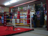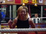 入場は当然本当は挑戦者であるはずのニッノーイが先です。しかも思いっきりタイのディスコで聴いた、しかも懐かしい予感のする曲。一部に陣取っているタイ人観客から嬌声が上がります。会場が小さいので、入場にはそれ程時間がかからずリングイン!さすがに50戦以上しているだけあって、リング上での緊張感は見られません。なんか、余裕って感じです。さて、その後のコールで、おーどりーひっぷばーんことNORIKOの入場です。そして音楽は、、、バードの「フェーンチャ」です。イントロ長いからあまり早く出るなって言っておいたのに、あっという間に出てきました。チャンピオンなんだから少しは引っ張れってねえ。イントロが終わって「フェーンチャ チャン マーレーウ チャ!」と聞こえてきた頃にはリングイン。せっかくこの歌で相手の戦意をそごうという作戦が。。。でも一部タイ人には受けてましたぞ、この曲。