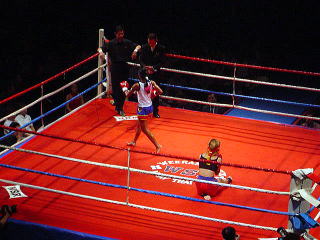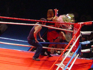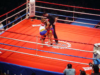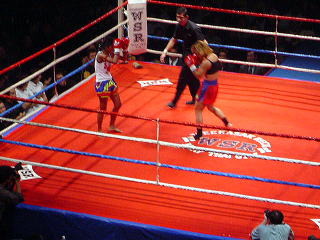で、リングアナのコールが終わり、ワイクルーが始まります。さすがにニッノーイ、タイ人だけあってワイクルーは手慣れたもの。非常にきれいなワイクルーを踊ります。それにしても、やはり体重差5キロの体格差はかなりのモノです。ニッノーイが先にワイクルーを終え、その後おーどりーさんが舞を終えます。ちなみに彼女、これまでの戦績がなんと、50戦を超えるというのだから驚きです。