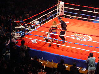 この一発で思わずダウンするニッノーイ。女子ムエタイでこのやり方をするタイ人はほとんどいないです。だいたいがキックの応酬、そしてエキサイトするとパンチ、と言うか殴り合いです。おそらくこういうタイプの選手と試合した事はないでしょう。実際に彼女と向き合ってスパーリングすれば分かるのですが、前へ前へ来るのでスゴくやりにくいのです。と、男の私が思うのですからかなりのモノです、ハイ。そしてその後もラッシュが続き、相手がダウン。横で見ていたエバンさんは大喜び。さらにエバンさんの奥さんもタイ語でエキサイト!しかしこの段階で管理人は、「少し休め〜、2Rまでもたせ〜!」と声を出していました。