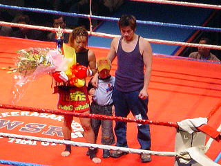 試合後、祝福に駆けつけるおーどりーパパさんとおーどりー息子さん。KO賞も頂き、3人で記念撮影!