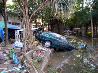 なんだかやっぱり大変なことになっているようです、プーケットを襲った津波。すでに日本のニュースの方が早い部分もあるようですが、現在のところの情報を。まず地震自体がものすごかったようですね。ここ40年で最大の地震、M8.9はあの阪神大震災の256倍の強さだそうです。もはやなん残っちゃという地震の規模です。さらに、午前1時過ぎ現在プーケットをはじめとしたタイ南部だけで300人弱(どんどん増えているので推定)が死亡、数千人のけが人、行方不明も多数です。特にこの地域、外国人観光客が多いため、数が把握できません。タイ国内では、ピーピー島の被害が一番大きいようで、島内の施設はほぼ壊滅しているようです。午後3時頃にマッピーのお母さんのこのあたりに住む友達から電話があったそうで、かなり深刻なダメージだと伝えられました。お母さんから「まおさん、プーケット行ってないか?」と電話してきたんですが、船が流されてかなり行方不明のようです。また、某有名旅行会社に勤める友達も仕事にかり出されました。ホテルの3階部分まで浸水した所もあるようです。みいさんのダンナさんの情報によると、パトンビーチの北にある日本レストラン音羽がなくなっていたらしいです。ホントか?。パトンビーチは現在関係者以外立ち入り禁止地域に指定されているそうでして、ホテルにいる日本人の安否もツアー客でさえ半分もつかめてないようです。個人旅行客だとほとんどわからないのが現状ではないでしょうか。それでもタイはまだ被害が少ない方で、スリランカ、モルジブ、インド、マレーシアなどもかなりの被害を被ってます。この津波だけで、8000人以上が死亡した模様です。これは津波の被害としては最大です。さらに、この大波はまだ続いているらしく、予断が許せません。地震自体、余震が続いているそうですし。タイのテレビでもやっと夕方過ぎからこの特番が始まり、放送をしてます。ただ、こういうのに慣れていないため、かなりごたごたした感じで、何をやってるのかいまいちわかりづらいです。プーケットの空港も封鎖になったとかですし、書いている管理人もなんだかゴタゴタしすぎて混乱してます。。。とにかく今回の津波ですごいのは、その早さ。普通地震が起きてから2時間程度で津波は来ないですよね。震源が浅かったのだと思います。それから津波警報も出てませんでした。日本だと地震の次は津波ってことで必ずアナウンスが入るのですが、地震自体もなんのアナウンスもなかったですし、津波なんて、、、とにかくいきなりだったのです。これだけ文明が栄えてきたというのに、なんの情報もなくやられるなんて、ちょっと先が思いやられます。