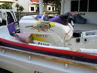 一応発見したジェットスキーは、徹底的に破壊されていました。なすすべもなく立ち尽くすだんなと友達・・・。実は運ぶために、普段はタイヤのついた荷台が下にありますが見事に離されてしまってどこにも見当たらず。