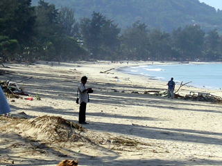 すでに世界で2万人以上、タイだけでも800人以上の死者と数え切れない行方不明者を出している今回のスマトラ自身とその津波。タイのテレビでもさすがにガンガン流れています。その映像は、、、あまり見たくないですね。死体もゴロゴロ転がってますし。。。みいさんの知人友人を始め、管理人の友達のバンコク在住タイ人の友達もやられたらしく、あわててプーケットに帰ってます。さらに、日本人で行方がわからない人もかなりいるようです。実際我々の所に安否の確認方法を聞いてくる方がたくさんいらっしゃいますが、残念ながらなすすべがありません。テレビで友人が見た話によりますと、パトンビーチに泊まっていた欧米人が朝の地震で出来たホテルのヒビをビデオに収めていたときに、急に波が引き津波がやってきたそうです。その時にビーチで寝ころんでる人たちもいたのですが、ほとんど気づいてなかったそうです。そんな映像が流れています。ホテルが倒壊したというのも結構あるようで、もうこうなると宿泊者の安否どころか、宿泊者が誰だったのかさえわかりません。さらにビーチには大事な物を持ち歩かないケースが多いので、誰が誰だかわからないというのもあります。これは勝手な推測なのですが、今回の津波では、観光地だったこともあり、まず外国人の救助などが先に行われた節があります。そのために当初死亡者の8割が外国人でした。そのため他の地区のタイ人からするとあまりぴんと来なかったのではないでしょうか?それから時間とともにタイ人の死亡者が増えるに連れて、やっとタイ人もびっくりして重い腰を上げた、そんな感じです。少なくとも被災者はこのことについてよい感情を持ってないはず。。。ま、これはあとでみいさんのレポートにも出てきますが。。。