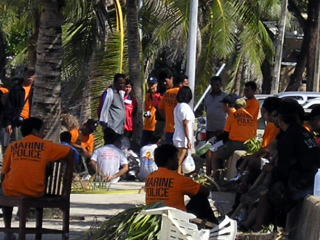出た火事場泥棒!中央の座っている3人はミャンマー人の泥棒。手錠を掛けられて、警官が包丁を突きつけて・・・話をしていました。海に落ちているごみを片付けるふりをして、携帯電話や財布など金目のものをあさっていたそうです。黒のゴミ袋に3つぐらいみつけたらしい。ジャンクセイロンという高級ショッピングセンターが建設中なのですがそちらの店からもパソコンなどの高価なものが盗まれたとのこと。