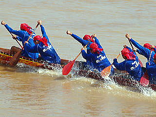 お祭りの一大イベントであるメコン川でのボートレースは迫力満点。