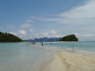 トップ島(タイ人の間でも非常に有名なのがここ。二つの島の間に砂州があって、歩いてわたれる。これは潮が満ち始めた頃の写真。ひざ下程度まで海水があるので疲れた。)