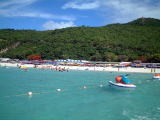 パタヤのビーチ各所から出ているスピードボートや、サウスパタヤから出ている乗り合いの船で行けます。スピードボートは交渉制なので、人によってはかなり高い料金になるかもしれません。また、余り安く値切ったら思いっきり漁船のようなモノに乗せられたこともあります。ちなみに普通は1500バーツプラスマイナス200バーツくらいではないでしょうか。人数が多い場合はこの方がお得です。島に着いたら帰る時間を言えば迎えに来てくれます(と言っても沖で待ってるのですが)。乗り合いの船はたしか一人100バーツしないで行けます。人数が少ない場合はこちらがおすすめです。 ラン島自体はさほど大きな島ではないですが、島内をバイクや車でまわることも出来ます。たいていは着いたビーチから一歩も動くことなく終わると思いますが…。ビーチは遠浅で干潮時には泳ぐのが困難なほど浅くなります。着いたビーチによって韓国人ばかりの所、中国人ばかりの所、ファラン(西洋人)の所になります。これは乗ってくるボート次第なのであまり選べません。ですので、一歩間違うと20年前の日本のビーチにいる気分にさせてくれます。あまりにもベタです。 食事はシーフードがメイン。当たり前ですが、料金は観光地価格。と言ってもそれほど高いわけではないのであまり気にしない方がいいでしょう。 ここで出来る遊びとしては、パラセイリング、ジェットスキー、バナナボートなどがあります。はっきり言ってパラセイリングは割に合いません。500バーツ程度でその辺をまわってくるだけです。お客が多いのでまさに大名商売と言った感じです。ジェットスキーはかなりおもしろいですが、危険でもあります。ジェットスキー自体でけがするのではなく、ぶつけてけがさせたり、壊したりしてしまうことです。こないだスキー同士をぶつけたファランが、修理代を請求させられていましたが、10万バーツ以上でした。その現場に居合わせた管理人が近くのタイ人に聞いたところ、ホントはそんなにしないんだけどねと言ってました。でも相手は休業補償やらなんやら言ってもっと請求するケースもあるようです。なんせブレーキの利かない乗り物なので、あまり無茶しない方が身のためです。ちなみに30分600バーツ程度から乗れます。もちろん値切ってですが…。バナナボートですが、暇なときに無理にお願いすると以上に安く遊べます。が、我々は1時間近く乗ったために身体中大変なことになってしまいました。マリンスポーツは普通のスポーツよりもかなり疲れることを忘れてしまっては行けないと言うことですね…。 |