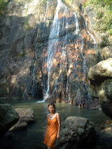 つづいてタイ人にはおそらく一番の人気スポットである滝です。 サムイには80メートルクラスの滝もあると言うことで、車で行こうとしたのですが、途中から歩いていくか象に乗っていくかしなくてはいけないと言われ断念しました。歩いていくと駐車場から上り30分下り15分だそうで、象で行くと一人800バーツだとか言われたような気がします。で、よくよく行くと車で行けるところにこの写真に載ってるような小さな滝があると言われ、すぐ直行しました。最初にも書きましたがタイ人は滝が大好きで、ピクニックと言えば海か滝と言った感じです。おそらくきれいな水がないからだと思うのですが、この滝で泳いでるタイ人はよく見かけます。ま、涼しいのがいいんでしょうね。ちなみにこの滝は15メートル程度のモノで、水はたいしてきれいとは言えませんでしたねえ。 |
